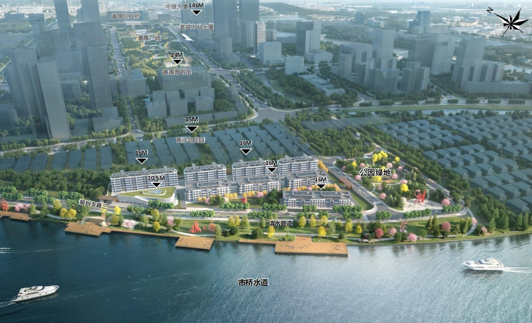 根据地块规划,项目将依托市桥水道生态景观,构建“前低后高”的建筑布局,限高16米—24米,新增约3.88万平方米公共绿地,配套滨水碧道、亲水平台与足球场,塑造番禺广场景观廊道的南部滨水节点。